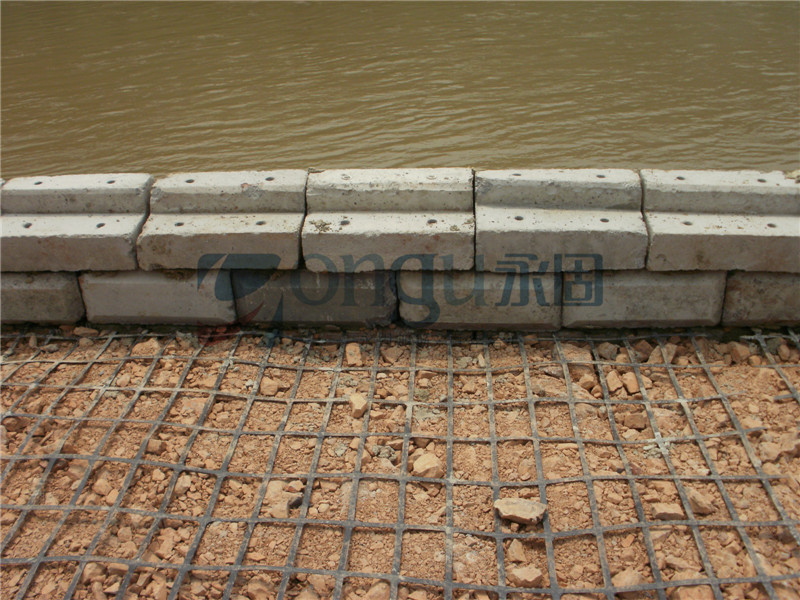 根据挡墙的地质情况以及防洪堤工程的要求,加筋土挡墙下部采用桩基托梁结构,上部采用模加筋土挡墙,墙面坡度1:0.1,整体钢塑土工格栅层间距0.4m。加筋土挡墙墙顶河滨大道道路和绿化带,荷载按公路行业汽-20考虑。