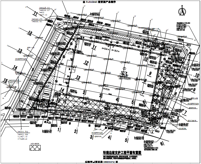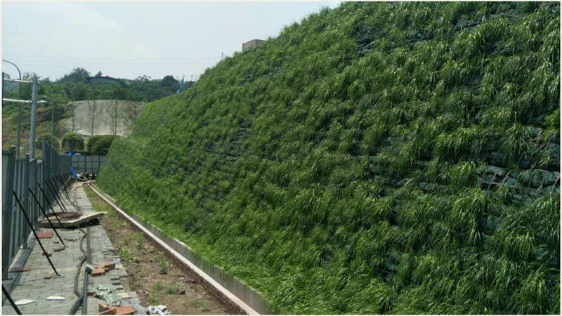因下方回填土层较深(最深处达20m),基底较为软弱,设计底部采用0.8m加筋垫层换填,设置两层CATTX50-50型整体钢塑土工格栅,上部为2-10m采用土工格栅包裹式加筋土陡坡形式支护,高度超过6米时中部留宽度2米台阶。坡顶设置截水沟、马道、坡脚设置排水沟,排水系统应就近接入市政雨水系统。最高剖面从下至上每阶加筋长度分别为20米、12米、10米和8米,加筋材料竖向间距0.4米。加筋区结构回填土要求综合内摩擦角不小于35度,块粒径不大于15cm,压实度不小于93%。经设计计算,土工格栅包裹式加筋土陡坡的整体稳定安全系数分为和1.37,满足建筑一级边坡安全系数不小于1.35的要求。加筋土陡坡采用整体钢塑土工格栅CATTX60-30型,坡面坡率为1:0.5。加筋坡面从外至内由两部分组成:(1)生态袋袋装种植土绿化;(2)300mm厚塑料编织袋袋装碎石层反滤。整体钢塑土工格栅在坡面处对种植土及袋装碎石反滤层进行反包。边坡施工中在墙面反包袋装体内设置草籽等绿化材料,后期对坡面浇水养护以便生态恢复。