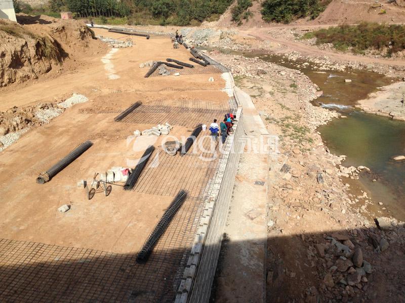 根据挡墙的地质情况以及防洪堤工程的要求,设计采用整体钢塑土工格栅模块式加筋土挡墙。挡墙墙面坡率为1:0.1,挡墙高于10m分为两级,分级台阶处封闭处理且可进行绿化,整体钢塑土工格栅竖向层间距0.4m。加筋土挡墙采用机械化作业,施工速度快、周期短,可适应一定的变形,结构体安全稳定系数高,可满足工期要求。模块式墙面造型美观,且可满足防洪抗冲刷要求。