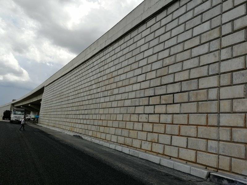 因征地限制,本项目中跨线立交桥引道两侧无法采用自然放坡,设计采用双面加筋土挡墙结构,端头处采用混凝土挡墙。A104路基宽度24m,墙高0-10m,单侧引道长约240米,引道两侧分别采用加筋土挡墙结构。永固公司提供从项目设计到施工的全程技术支持。