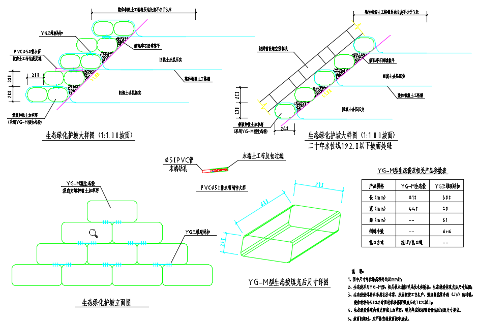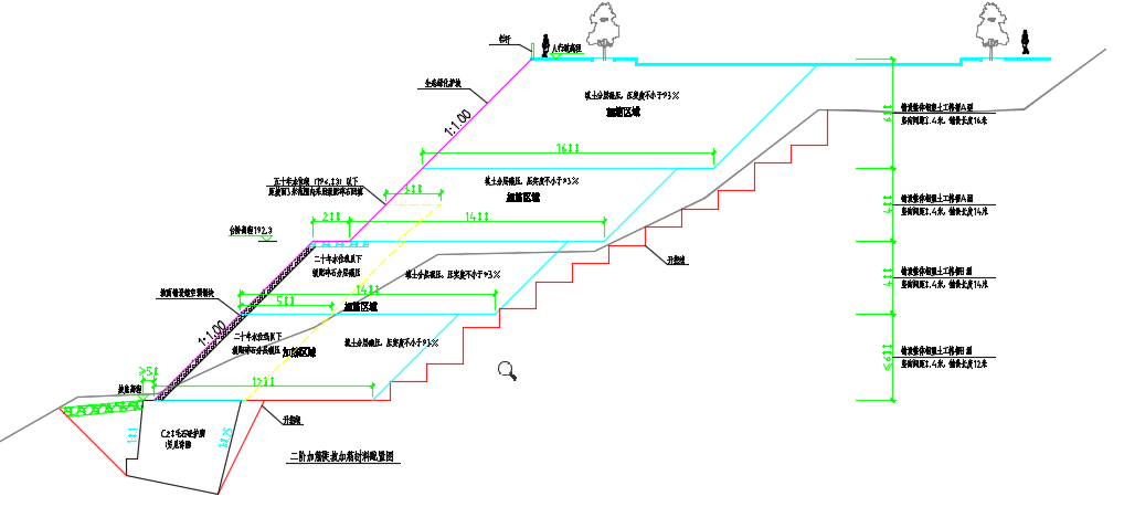 整体钢塑土工格栅在坡面处对种植土及碎石反滤层进行反包。加筋区外填料选取场地内开挖弃方,严禁采用淤泥、腐质土、白垩土及硅藻土等。施工中在墙面反包袋装体内设置草籽等绿化材料,后期对坡面进行养护以便生态恢复。
