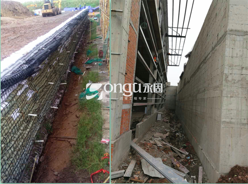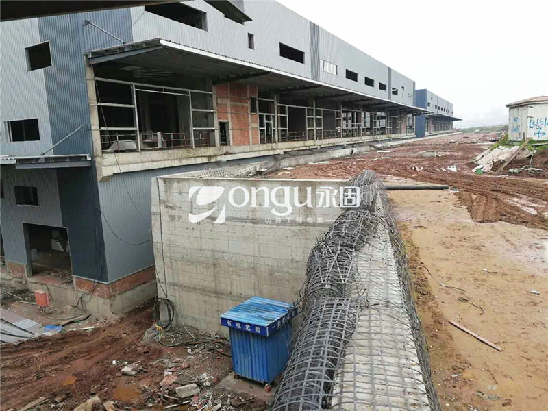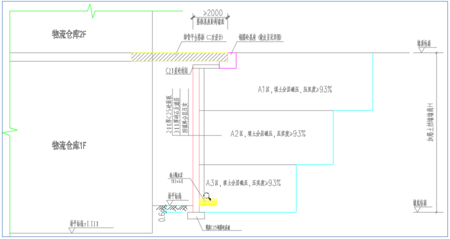 因地基较为软弱,先开挖基底清除表面覆盖杂填土,开挖采1.5米深,采用加筋垫层换填地基,垫层上方采用垂直后浇整体式墙面加筋土挡墙进行支挡,墙高5~10米。墙面通过结构板与仓库二层相接。