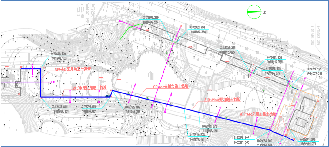 A4a~A15段挡墙长约522米,高度6.7~10.5米。结合本工程实际情况,经多种方案对比后,设计采用加筋垫层+整体现浇钢筋混凝土墙面加筋土挡墙方案。