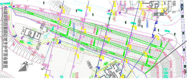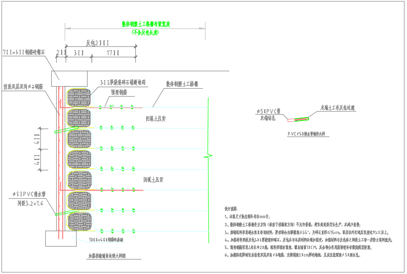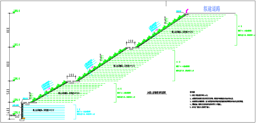 设计采用直立式现浇墙面加筋土挡墙+土工格栅包裹式加筋土边坡方案。因边坡较高处自然放坡水平距离不足,设计采用高度不超过4米现浇钢筋砼墙面加筋土挡墙收住坡脚,上方自下至上采用1:1.75、1:1.75和1:1.50三级生态坡面加筋土边坡,中部留2米水平台阶,设置水沟,每阶底部均设置碎石水平排水层。整体钢塑土工格栅做为加筋材料,竖向间距0.4米。坡面采用土工格栅包裹生态袋全柔性墙面,可适应变形后期可绿化。加筋土边坡施工中在坡面反包袋装体内拌入草籽等绿化材料,后期对坡面浇水养护以便生态恢复。