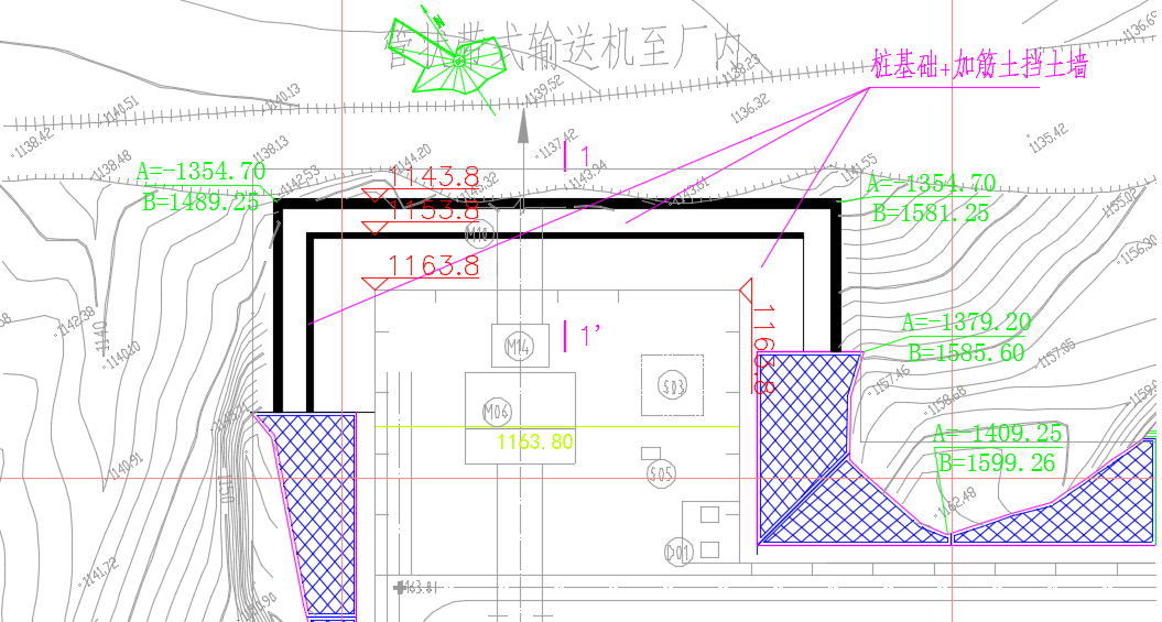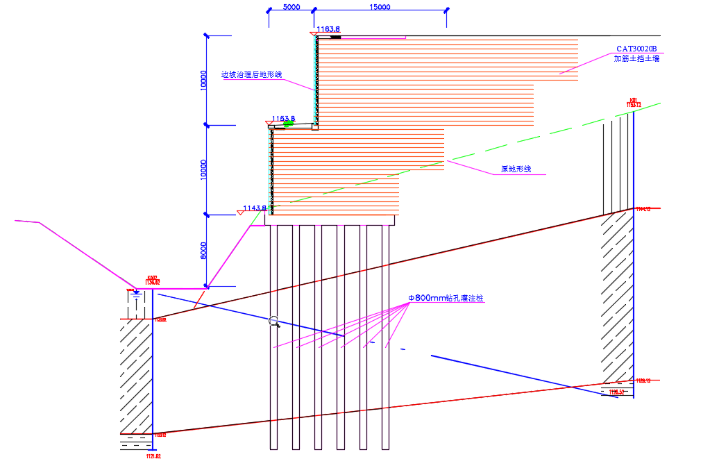 因基础较为软弱,为保证加筋土挡墙承载力要求和作业宽度,将1143.8m平台挖平,地基采用Φ800mm钻孔灌注桩处理,嵌入强风化砂质泥岩不小于2.5m,以满足承载力要求。