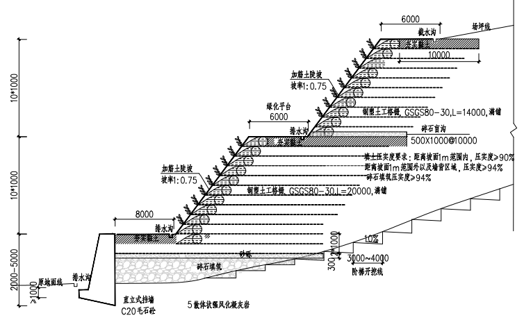 设计采用毛石砼挡墙+生态加筋土边坡。对于半填半挖区域为减少开挖,挡墙底部采用毛石砼挡墙,上部采用生态柔性加筋土陡坡,墙面坡率1:0.75。加筋土挡墙局部分为两阶,中部设置2米宽水平台阶,每阶挡墙底部设置0.5*1.0m碎石盲沟,水平间距10m。加筋材料采用整体钢塑土工格栅,竖向间距0.5m。