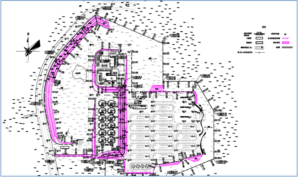 本工程场地整平将产生大量的人工边坡,形成挖填边坡,根据场地地形分为填土边坡、土质边坡、岩土质边坡(主要指强风化岩与其他土层组成边坡),边坡的总长度约3400m,拟建边坡高约3~31m。本项目场区共分为三个平台,场平标高分别为159.45、175.00、188.50左右。为使建设用地最大化,同时兼顾投资和环境和谐,对于较为高大的填方边坡无自然放坡条件的地段,拟采用加筋土陡坡结构进行支护,主要区域有: