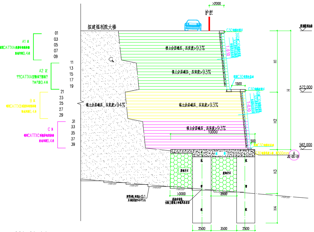 经方案对比,设计采用两阶20米直立式预制墙面加筋土挡墙+抗滑桩方案,加筋土挡墙单阶不超过10米,留不小于2米台阶。加筋土挡墙设计采用整体钢塑土工格栅做为加筋材料,竖向间距0.4米,Y型预制模块墙面,墙面坡率1:0.1。