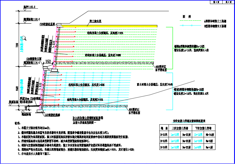 结合现场实际地形和地质条件,设计采用换填+加筋垫层+反包整体式墙面加筋土挡墙的结构形式。挡墙基底进行开挖换填,先换填1.2米厚石碴,后换填1.5米厚碎石土,碎石土内间距0.5米铺设双向整体钢塑土工格栅三层。加筋土挡墙墙高6~14米,坡率不陡于1:0.1,中部水平设置2米台阶,挡墙底部设置水平40cm碎石排水层,采用整体钢塑土工格栅做为加筋材料,竖向间距0.4米,加筋结构区填料采用红粘土混合碎块石料,最大粒径不超过15cm,综合内摩擦角不小于30度,压实度不小于94%。为避免工后变形过大拉裂墙面,加筋体先施工完成,同时预埋墙面锚杆钢筋,待加筋体变形基本稳定后,挂钢筋网支单边模现浇墙面。