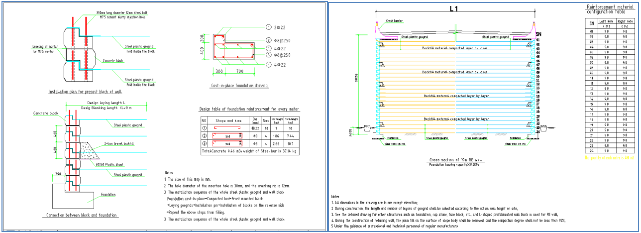 4.挡墙排水:在墙趾外侧设置40cm宽浆砌片石排水沟,由于挡墙左右两侧及顶面全部封闭,顶部因纵坡自然排水,面板处梅花状布置泄水孔,泄水孔后采用级配碎石反滤包。